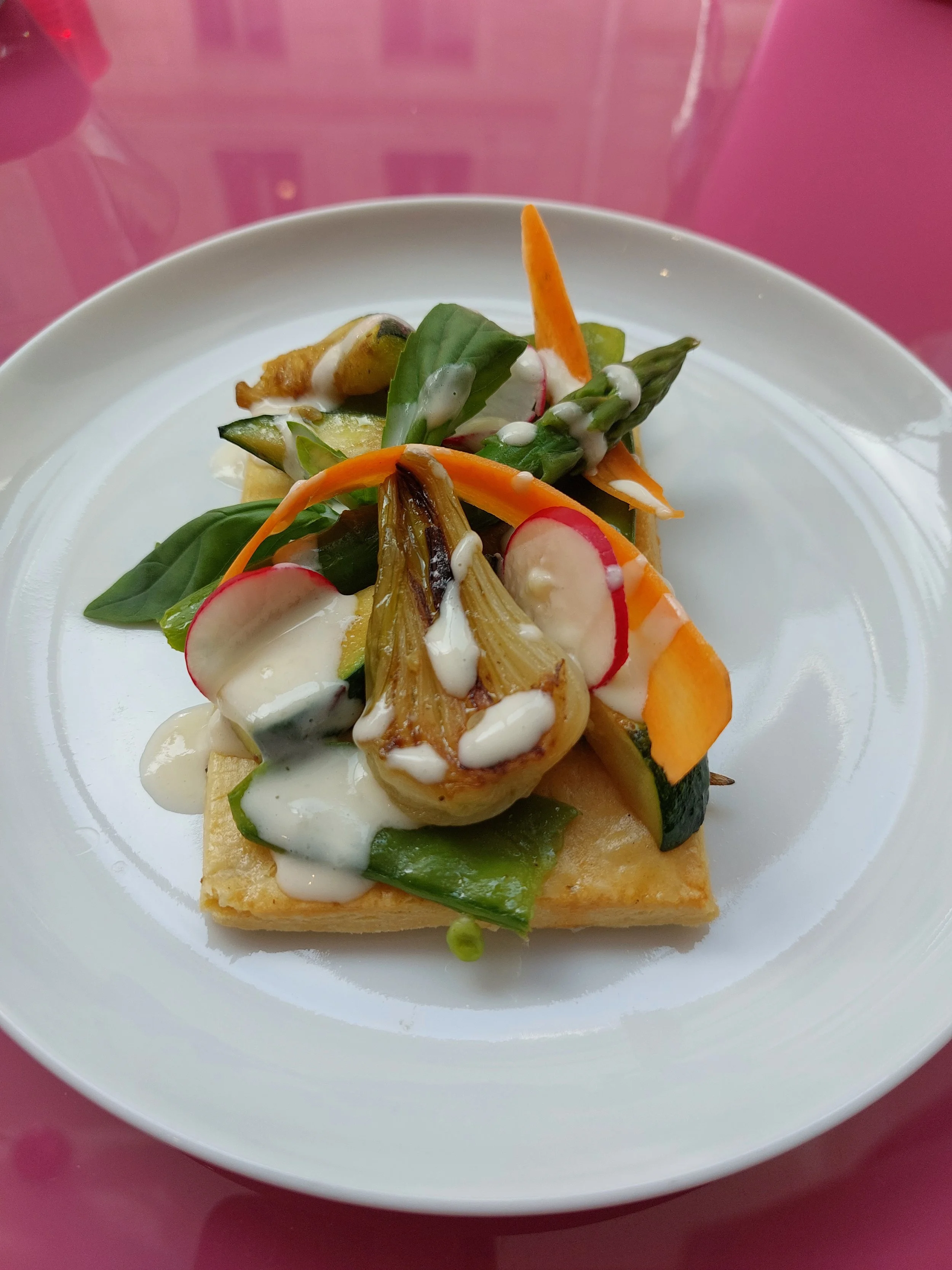 Puff Pastry Tart with marinated tuna, stewed tomatoes with onion and basil sauce